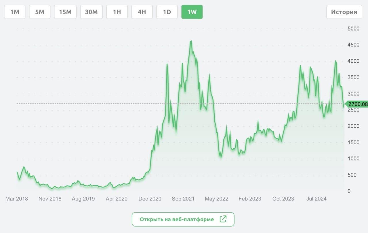 Динамика стоимости токена Ethereum на криптовалютной бирже Dzengi.com
