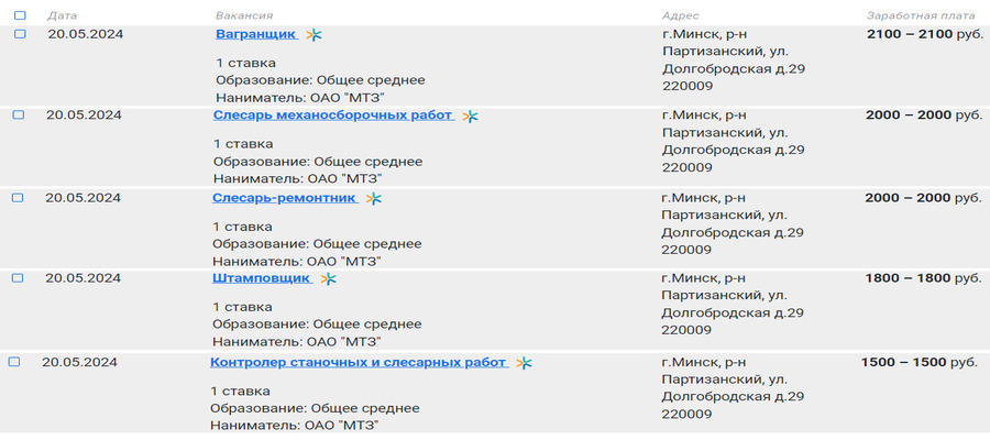 Ряд вакансий заявлен от Минского тракторного завода. Зарплату в районе 3000 рублей обещают наладчику станков и манипуляторов с программным управлением, а также обрубщику.