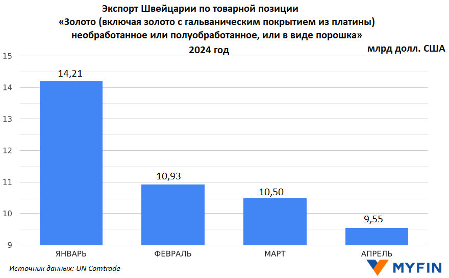 По информации UN Comtrade, в январе 2024 года Швейцария экспортировала золота на сумму $14,21 млрд.