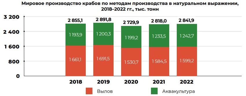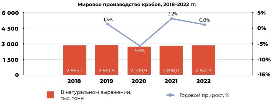 Мировое производство крабов в 2022 г. увеличилось по сравнению с уровнем предыдущего года на 0,8%, составив более 2,8 млн тонн.