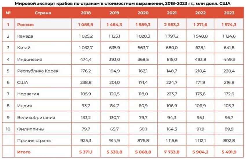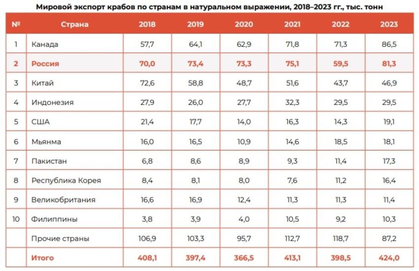 В натуральном выражении в пятерку ведущих экспортеров крабов по итогам 2023 г. вошли Канада, Россия, Китай, Индонезия и США.