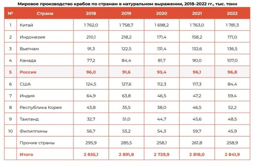 В Индонезии в 2022 г. добыто порядка 171,0 тыс. тонн крабов (6,0% общемирового производства), во Вьетнаме – 136,5 тыс. тонн (4,8%).