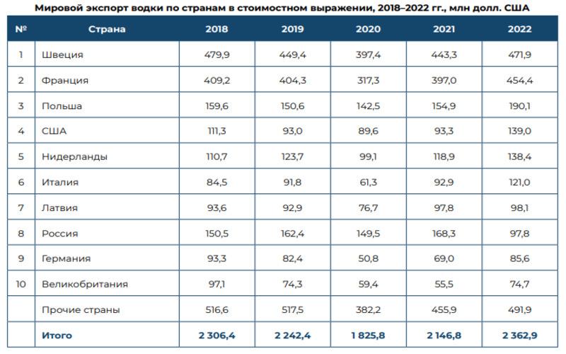 В 2022 году мировой экспорт водки составил $2,36 млрд, по отношению к 2021 году поставки выросли на 10,1%.