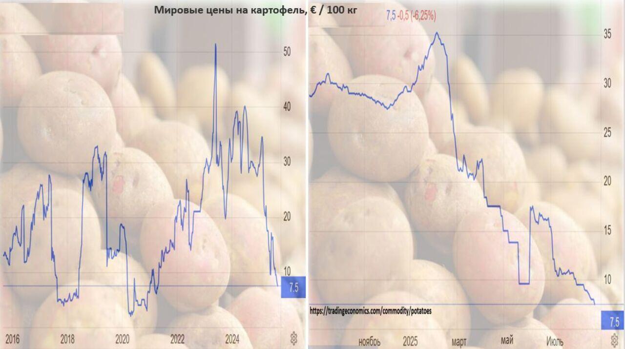Мировые цены на картофель 25 августа упали до 7,50 евро/100 кг. Это на 6,25 % меньше, чем в предыдущий день. Об этом сообщает портал tradingeconomics.com.