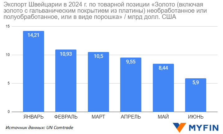 В разрезе года наблюдается сокращение поставок золота из Швейцарии и отрицательная динамика экспорта от месяца к месяцу.