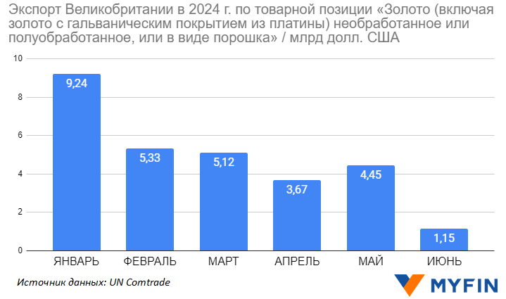 Если в январе текущего года Великобритания поставила благородного металла на $9,24 млрд, то в июне экспорт оказался на уровне $1,15 млрд.