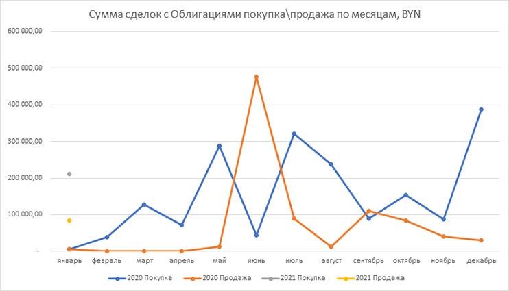 Аналогичная картина складывается в начале текущего года. В январе объём сделок с облигациями уже достиг 296 382,26 белорусских рублей (на 211 739,92 куплено и на 84 642,34 продано). Объём сделок с акциями опять существенно ниже – куплено на 10 410,31 белорусских рублей, продано на 4 602,23 и общая сумма 15 012,54 белорусских рублей.
