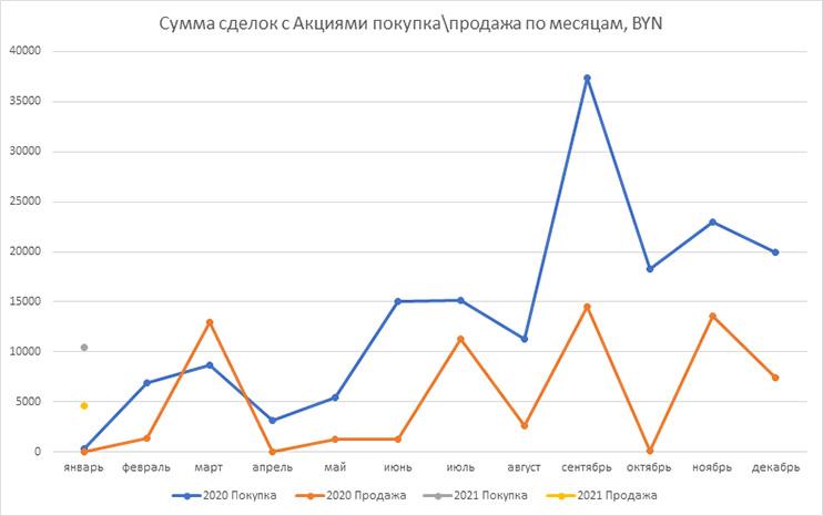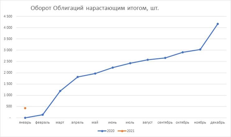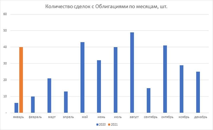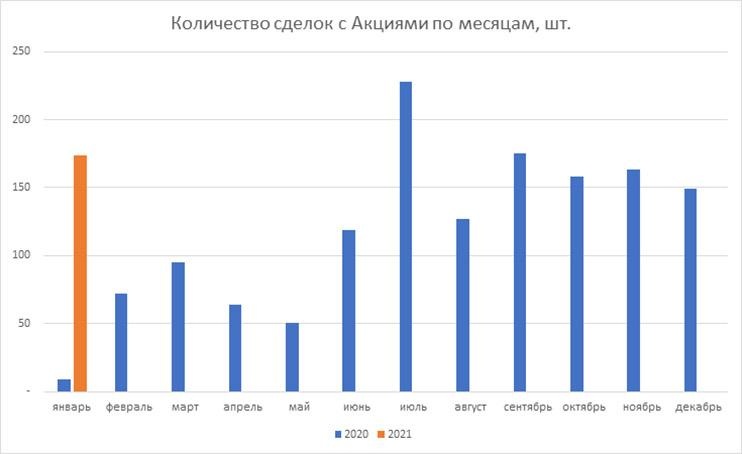 В 2020-м году было проведено 324 сделки с облигациями (в январе 2021-го уже 40). За этот же период с акциями было проведено 1 410 сделок (в январе 2021-го года 174).