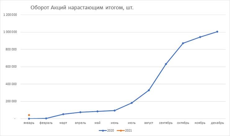 За 2020-й год общий оборот облигаций составил 4 169 штук (в январе 2021-го уже 434 штуки). Оборот акций на несколько порядков больше – 1 004 539 штук (январь 2021-го 41 812 штук). Помесячная динамика торгов посредством мобильного приложения AIGENIS invest была почти одинакова.