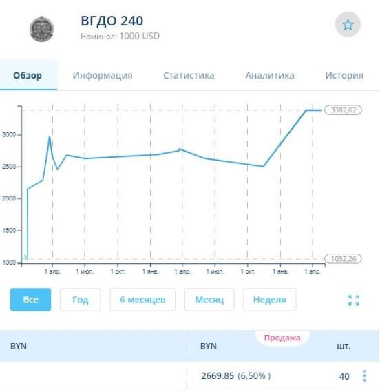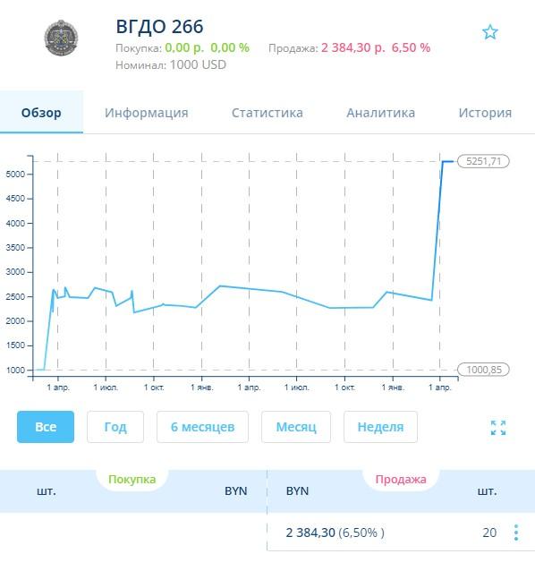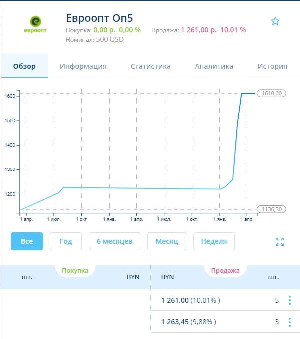 Например, на сегодняшний день на рынке можно найти предложение купить облигации ЕВРООПТ Оп5 номиналом 500 USD по цене 1261 BYN/шт. и с доходностью 10,01%. Дата погашения облигаций – 12.01.2024 (до погашения 1 год и 7 месяцев).