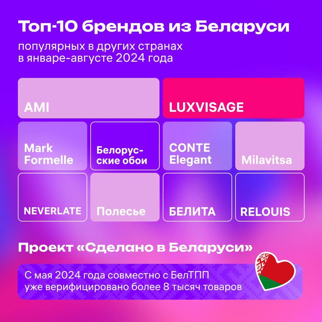 Самыми популярными на Wildberries у зарубежных пользователей стали такие белорусские бренды, как AMI (мебель), Mark Formelle (повседневная одежда и трикотаж), «Белорусские обои», CONTE Elegant (трикотаж), Milavitsa (женское белье), NEVERLATE (спортивная одежда), «Полесье» (игрушки), а также LUXVISAGE, «БЕЛИТА» и RELOUIS (косметика).