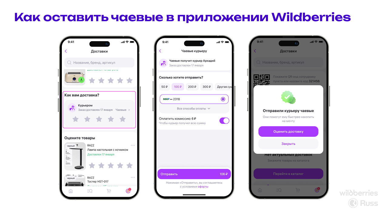 Глава Объединенной компании Wildberries и Russ Татьяна Ким отметила, что покупатели все чаще стали сообщать о своем желании выразить дополнительную благодарность за качественное обслуживание не только высокой оценкой в приложении, но и денежным вознаграждением – именно поэтому в приложение и был внедрен пилотный сервис «Чаевые».
