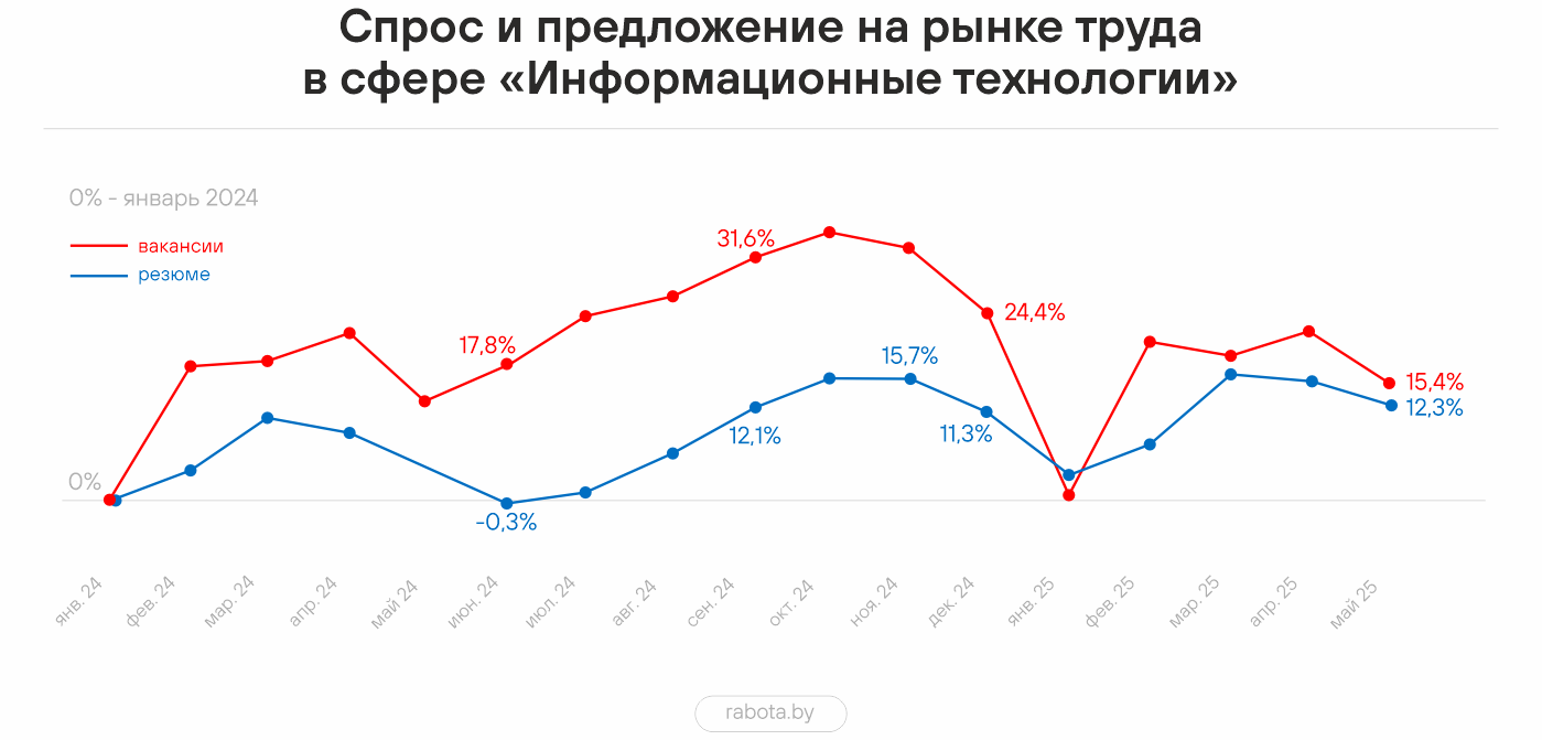 Я много лет занимаюсь аналитикой рынка труда и вижу, что еще некоторое время назад работники сферы IT стабильно занимали 2–3 место в топ самых востребованных специалистов. Сейчас это 9–10 место. Но есть и позитив. За последние 12 месяцев IT-сфера стала наиболее динамично растущей: вакансий становится больше. В этом году количество вакансий выросло на 15,4 %, в прошлом – на 30 %. Темп роста теперь ниже, чем в среднем по рынку, но мы помним, что в прошлом и позапрошлом году были высокие темпы роста количества соискателей.