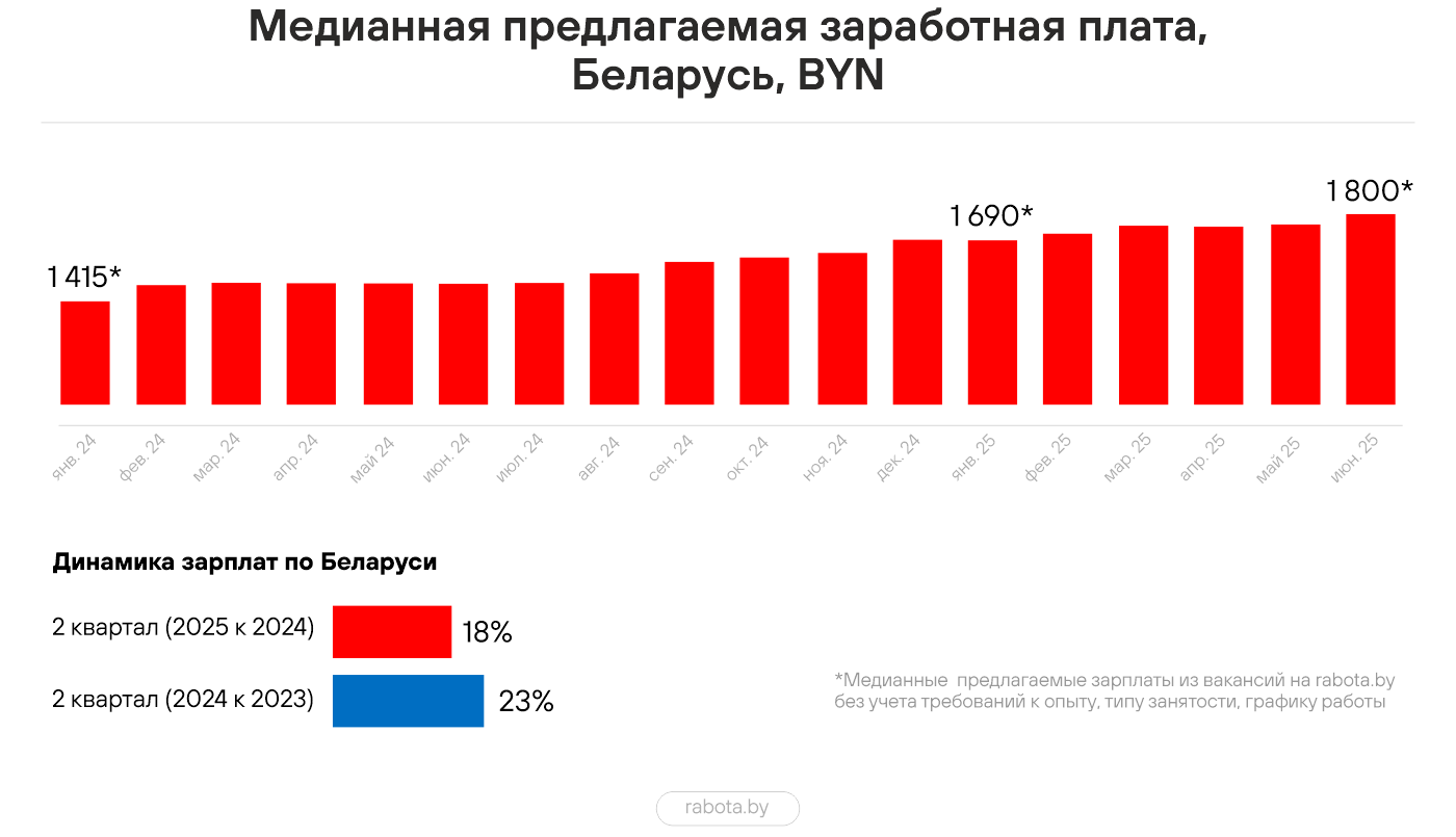 Мы увидели, что в 2024 году медианная зарплата выросла на 23 % по сравнению с 2023-м (сравниваем II квартал). Сейчас, если сравнить 2025-й и 2024-й – рост зарплат продолжился, но темп роста замедлился: теперь он составил 18 %. Отмечу, что медианная заработная плата — это не среднее, а серединное значение. При анализе зарплатных предложений 50 % исследуемых работодателей платят больше, 50 % предлагают меньше. То, что ровно посередине – и есть медиана, о которой мы сейчас говорим.