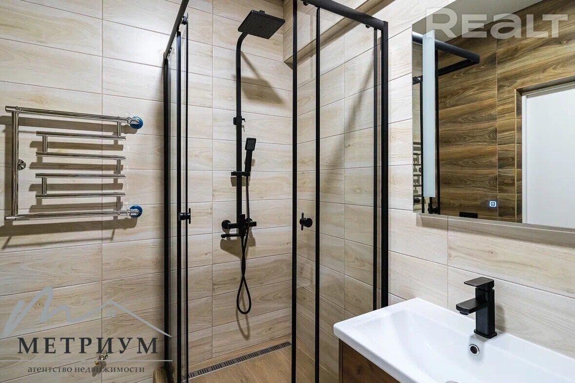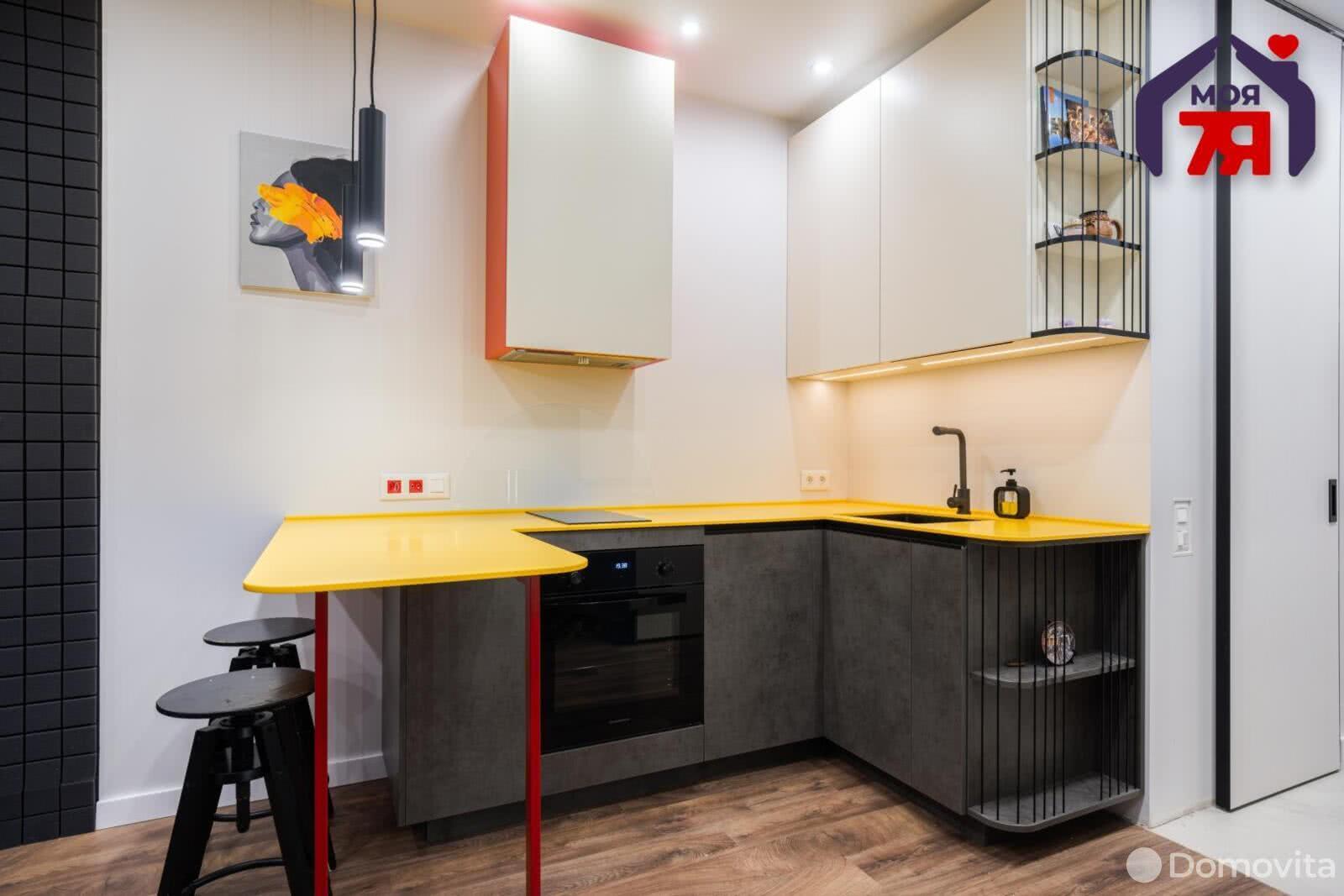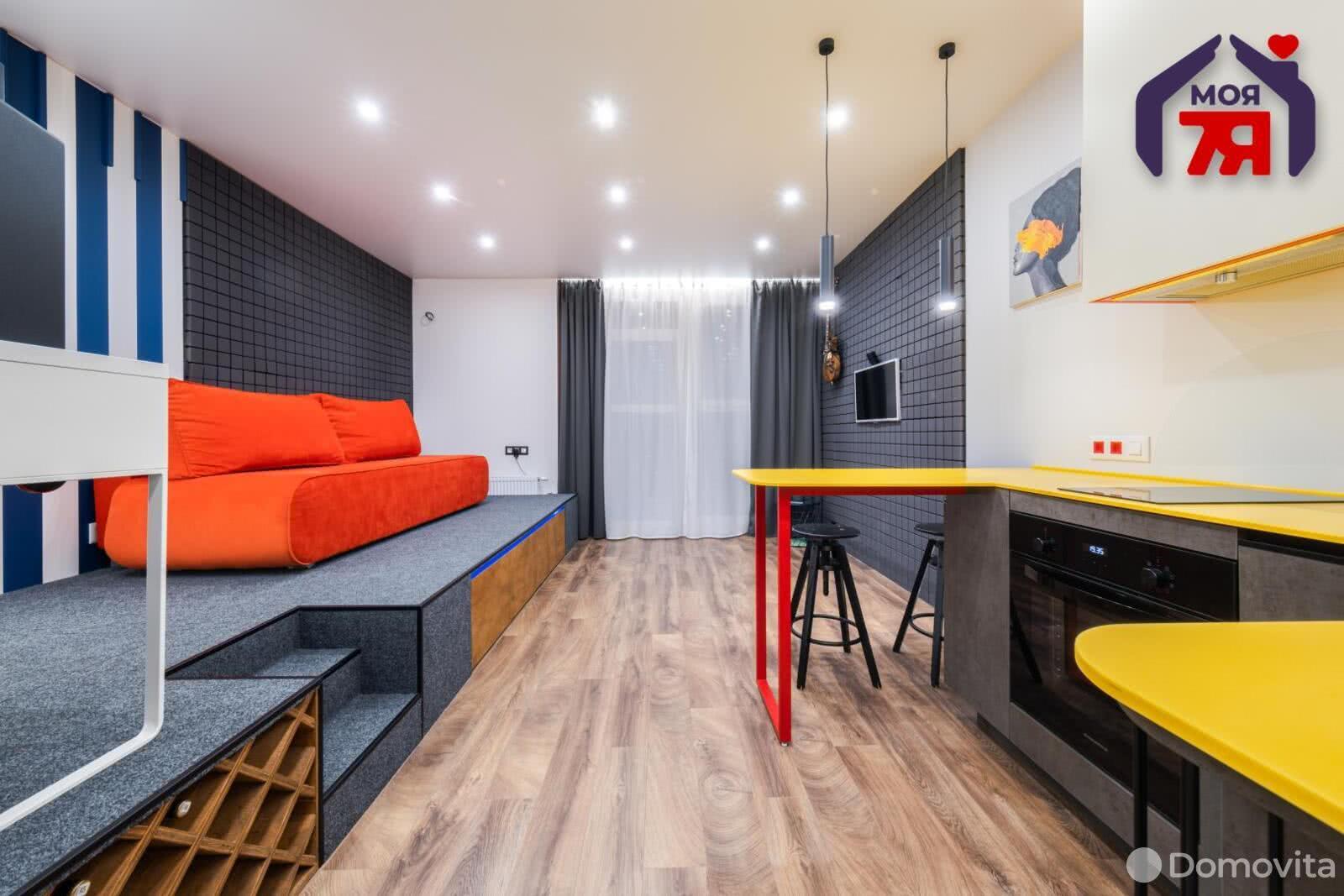 Яркую квартиру с дизайнерским ремонтом мы нашли снова в «Минск Мире». Каркасно-блочный дом был построен в 2021 году, находится жилье на 22-м этаже. Общая площадь студии – 31,7 кв. м. В доме есть паркинг и пандус, установлено видеонаблюдение. В студии сделан ремонт: установлен кухонный гарнитур со встроенной варочной панелью и посудомоечной машиной, уложен ламинат в комбинации с плиткой, установлены натяжные потолки и входная металлическая дверь. Есть застекленная лоджия, санузел – совмещенный. Во дворе находится детский игровой комплекс, баскетбольная площадка и тренажеры для занятия спортом.