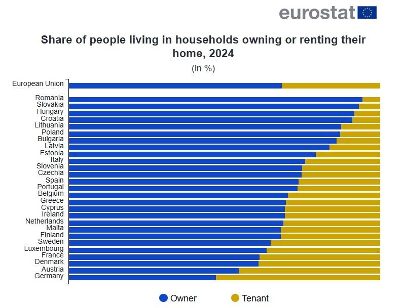 По данным ведомства, в 2024 году около 68% населения, проживающего в домохозяйствах ЕС, владели собственным жильем. Остальные 32% проживали в съемном жилье.