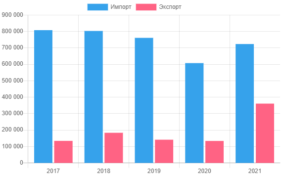 По данным Белстата, в 2021 году товарооборот между Беларусью и Турецкой Республикой составил $1083,2 млн, увеличившись более чем на 46% к уровню предыдущего года. Экспорт белорусских товаров вышел на уровень $360,5 млн, импорт из Турции – $722,7 млн.