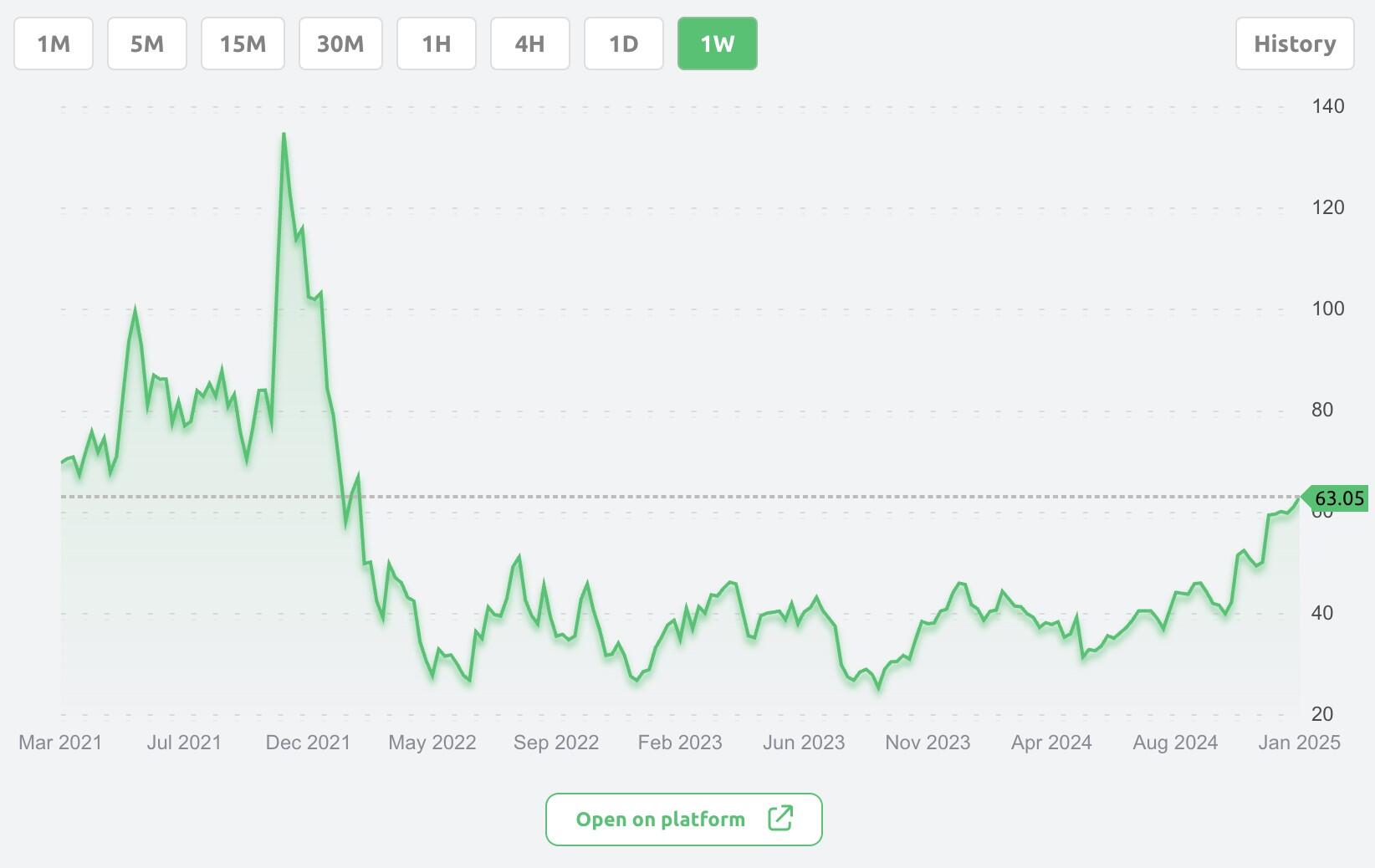 Динамика стоимости токенизированных акций Roblox Corp. на платформе Dzengi.com