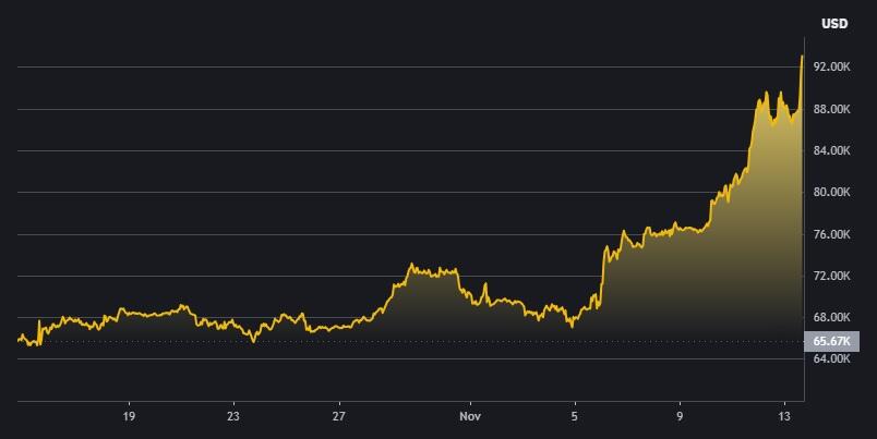Стоимость биткоина впервые в истории превысила $92 тысячи.