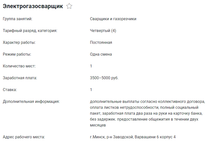 Зарплатное предложение для тракториста-машиниста сельскохозяйственного производства (Крестьянское хозяйство Шруба М.Г.) составляет 3500–5500 руб., электрогазосварщика (ЖЭУ №2 Заводского района г. Минска) – 3500–5000 руб.