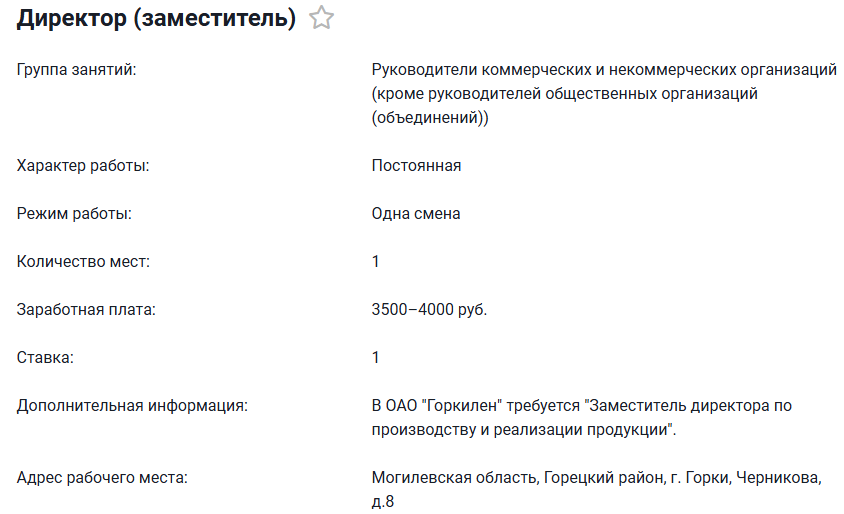 Такую же заработную плату обещают заместителю директора по производству и реализации продукции (ОАО «Горкилен»).