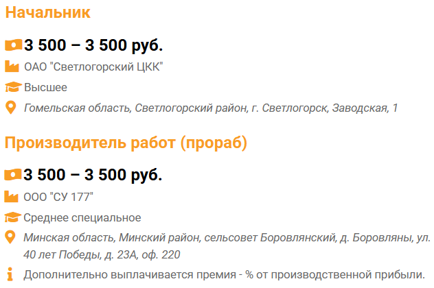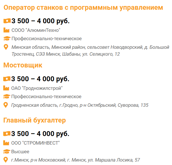 Зарплату на уровне 3500–6000 руб. предлагают программисту (ООО «БТВ-Агро»), 3500–5000 руб. – ведущему аудитору (ООО «БелАудитАльянс»).