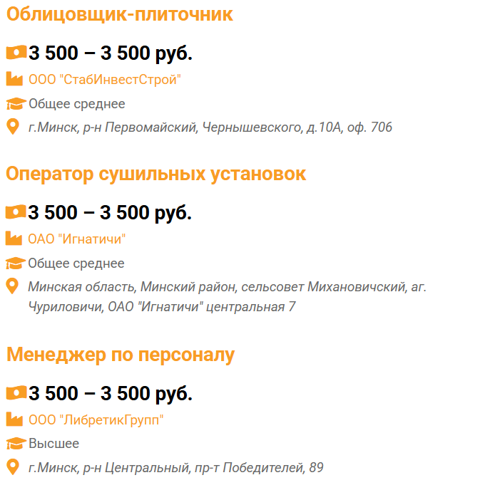 Зарплату в диапазоне 3500–5500 руб. предлагают машинисту экскаватора (УП «Вторичный щебень»), 3500–4500 руб. – кровельщику по металлическим кровлям (ООО «ТОССАТ»).