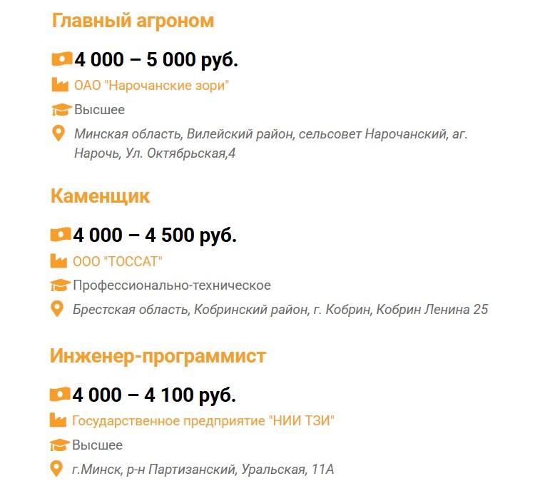 Зарплатное предложение для специалиста по тестированию программного обеспечения (ООО «Триовист») составляет 4000–4600 руб., главного ветврача (ОАО «Кленовичи») и прораба (ООО «СМК АСТРОЙ») – 4000–5000 руб.