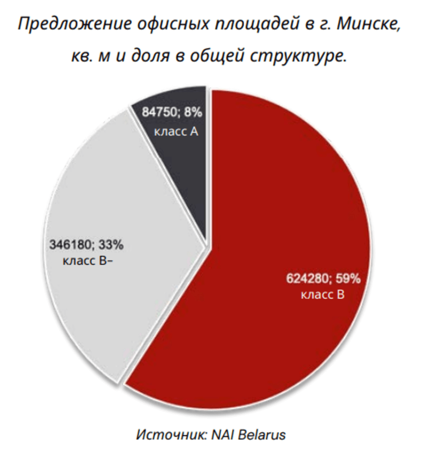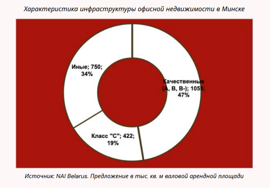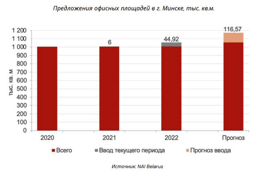 По состоянию на конец 2022 года в г. Минске предлагалось практически 1 млн 55 тыс. кв. м арендной площади в бизнес-центрах, предназначенных для целей аренды и относящихся к классам «А», «В» и «В-». В 2021 году, не вводилось крупных объектов, поэтому следующий за ним год стал прорывным и в плане ввода в эксплуатацию, и в плане качества предлагаемой новой офисной недвижимости.