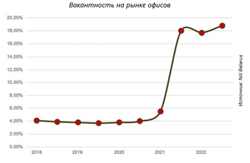 В I полугодии 2022 года в связи с возникшей нестабильностью в регионе и усилением санкций процесс релокейта усилился, что стимулировало дальнейший отказ от аренды, в том числе со стороны крупных арендаторов, таких как Wargaming. По итогам всего года по причинам релокейта, сокращения штата или просто сворачивания бизнеса продолжились факты отказов от аренды. Рынок офисной недвижимости трансформировался с рынка арендодателя в рынок арендатора. Ставки арендной платы по отношению к уровню конца 2020 года снизились. Если наиболее характерный диапазон в востребованном классе «В» в тот период находился на уровне 12-20 евро, то в конце 2021 года наиболее характерный диапазон составил 9-16 евро за 1 кв. м.