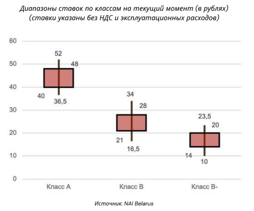 Здесь указаны минимальные и максимальные рублевые ставки, характерные для классов офисов, а также наиболее распространенный ценовой диапазон в каждом из классов.