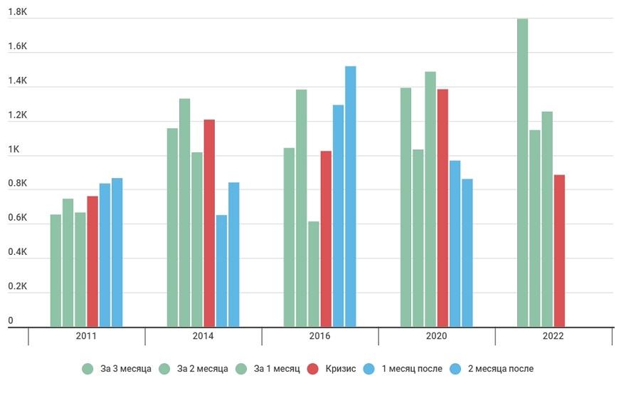 Пятый серьезный кризис прямо сейчас в феврале-марте 2022 года. Мы уже видим рост стоимости метра с 3250 до 4150 рублей. И если смотреть на рынок со стороны рубля, в котором большая часть населения получает доходы, – это исторический максимум. Со стороны оценки в долларах это близко к ситуации 2016 года, когда рынок достиг своего дна.