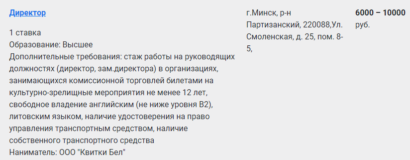 На такую зарплату ищут директора. Наниматель – общество с ограниченной ответственностью «Квитки Бел».