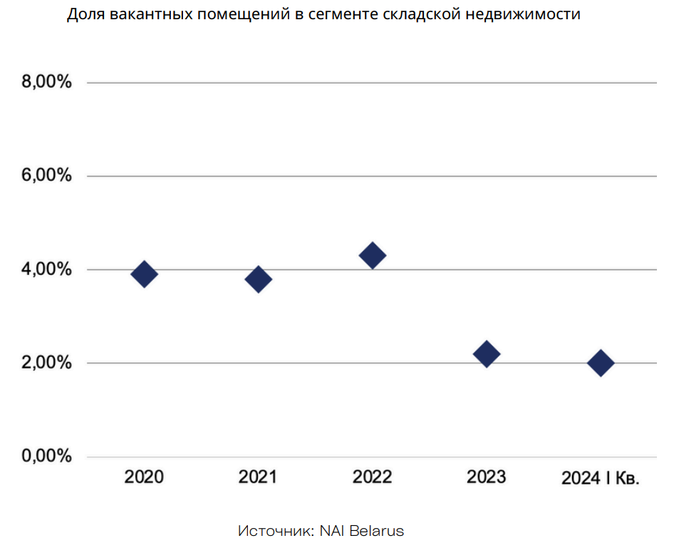 Спрос в сегменте складов сохраняется стабильным и устойчивым на протяжении нескольких лет. Первые месяцы 2024 года продолжили тенденцию на сохранение спроса.