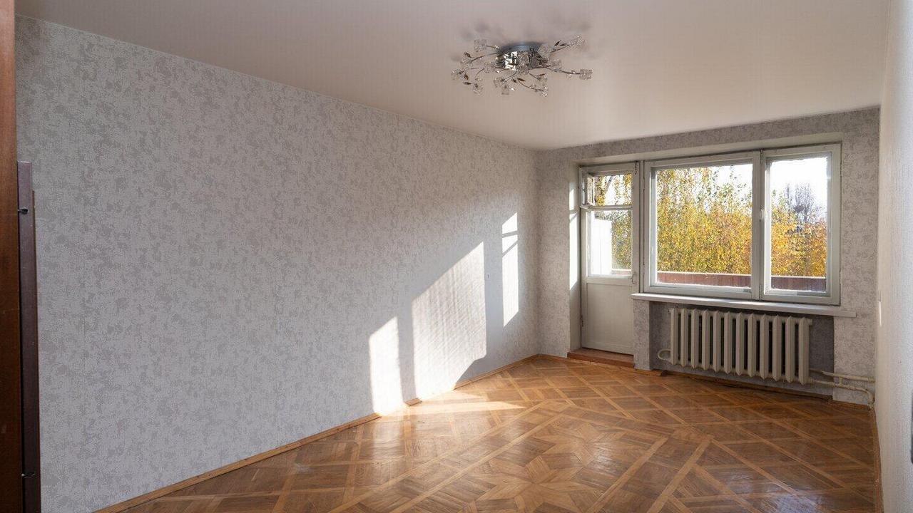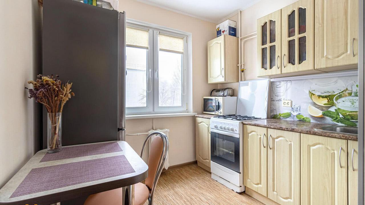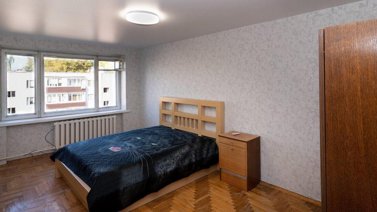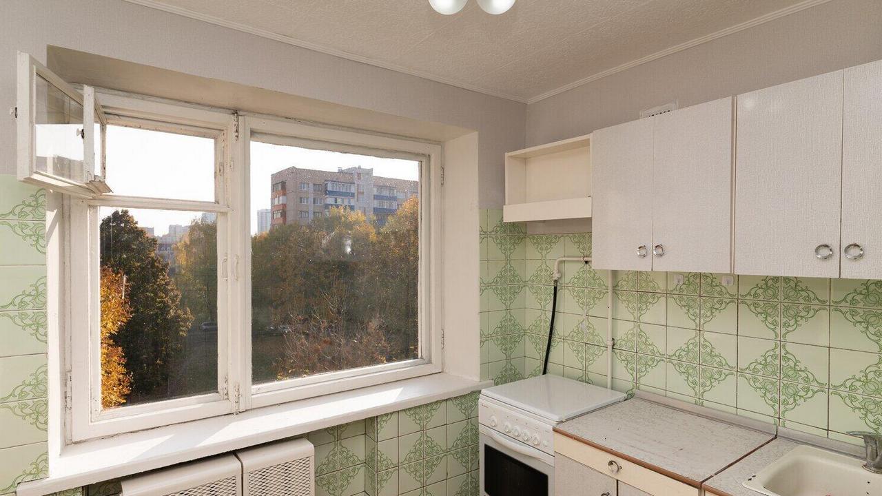 Квартира в доме, который находится возле улицы Притыцкого, одной из транспортных магистралей города, и в 9 минутах ходьбы от метро. Двухкомнатная с проходной без свежего ремонта, с обоями в цветочек, деревянными рамами на окнах, хотя и с плиткой в ванной и на кухне. Здесь 44,5 квадратных метра площади, а квартира находится на пятом этаже в доме без лифта.
