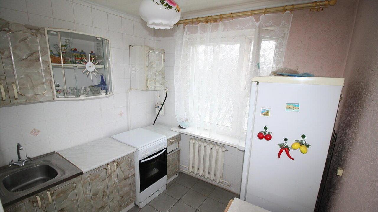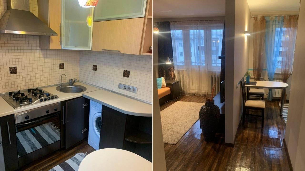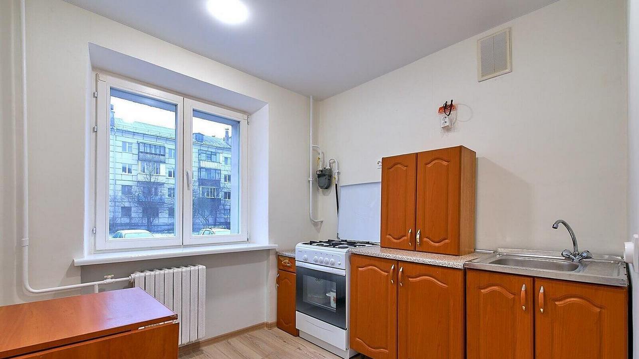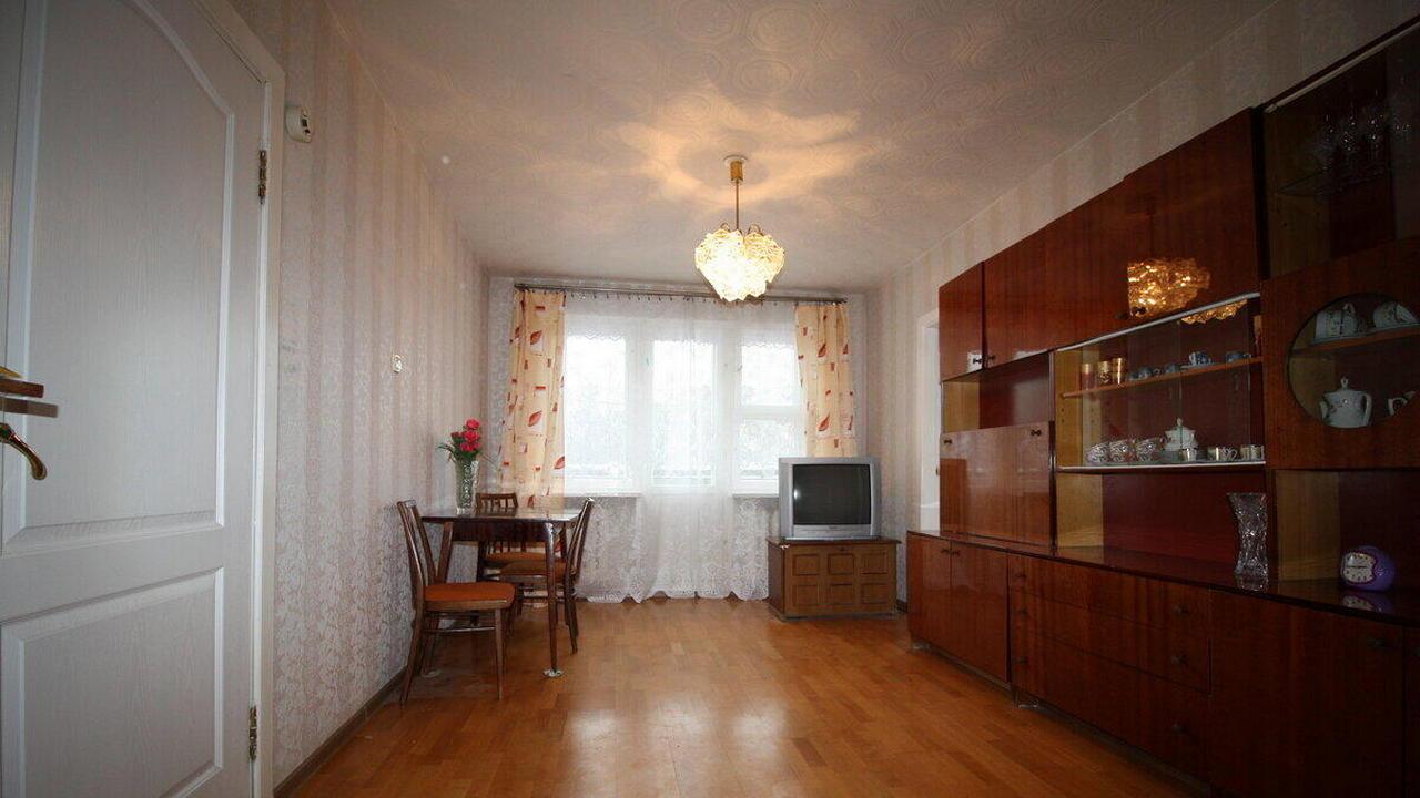 Квартира в доме, который находится возле улицы Притыцкого, одной из транспортных магистралей города, и в 9 минутах ходьбы от метро. Двухкомнатная с проходной без свежего ремонта, с обоями в цветочек, деревянными рамами на окнах, хотя и с плиткой в ванной и на кухне. Здесь 44,5 квадратных метра площади, а квартира находится на пятом этаже в доме без лифта.