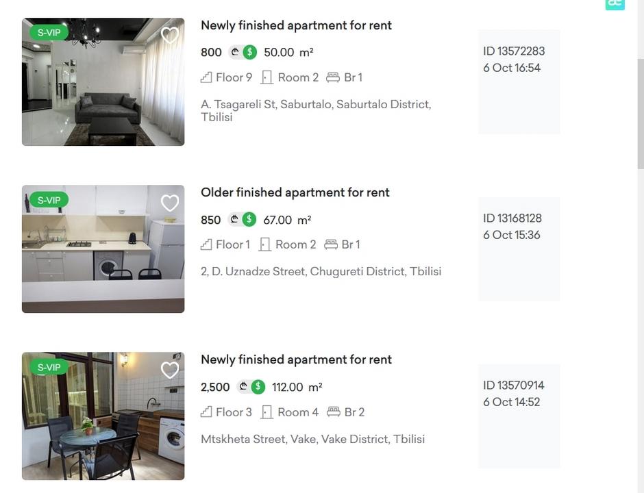 Если посмотреть на профильных сайтах для посуточной аренды квартир и гостиниц в Казахстане, то в октябре в Алматы и Астане доступны совокупно не более 100 вариантов, когда в ноябре уже можно рассчитывать на 800 предложений. В Тбилиси и Ереване ажиотажа на квартиры в октябре нет.