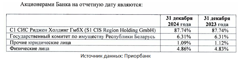 Акционерами банка на конец 2024 года выступали: S1 CIS Region Holding GmbH, Госкомимущество, прочие юрлица, физические лица.
