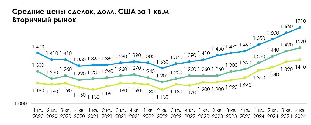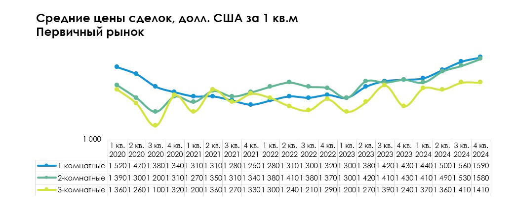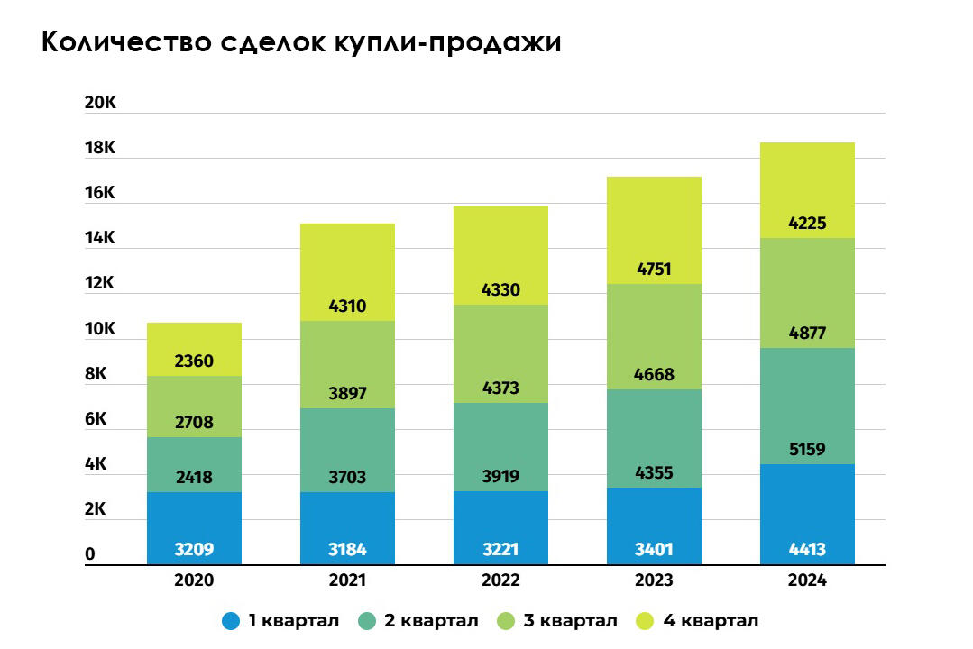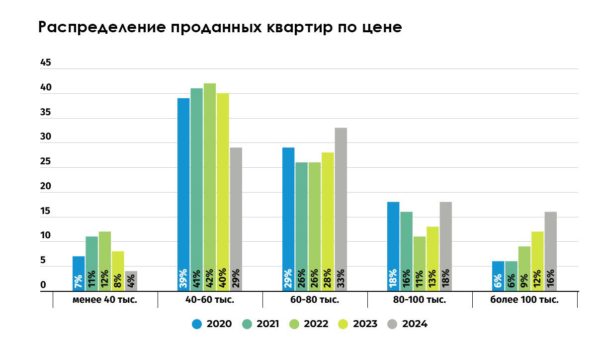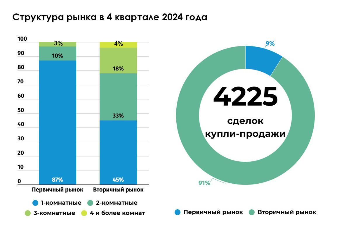 В структуре сделок по-прежнему преобладали однокомнатные квартиры (48%). В то же время в сравнении с 2023 годом фиксировался рост объема приобретенных квадратных метров на 7%.