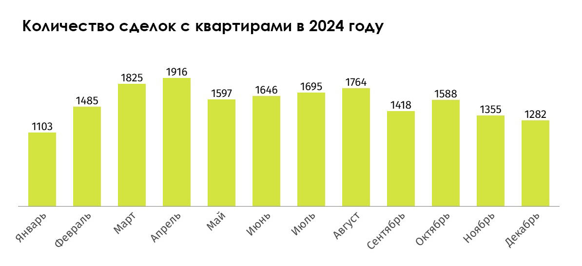 Наибольшее количество договоров было оформлено в апреле (1916 сделок), а хуже всего жилье в столице расходилось в январе (1103 сделки) и декабре (1282 сделки).