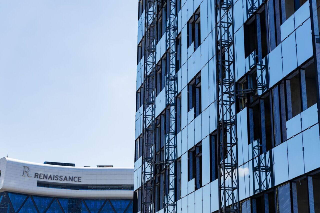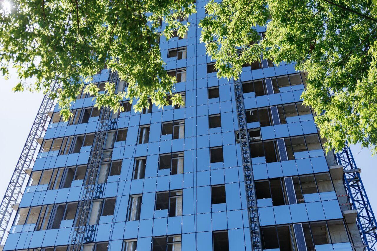 23-этажный комплекс достраивают на проспекте Дзержинского напротив отеля «Ренессанс». Весной был готов каркас из прочного железобетона, после чего бригады занялись панорамным остеклением. Фасадные работы должны завершить до конца лета.