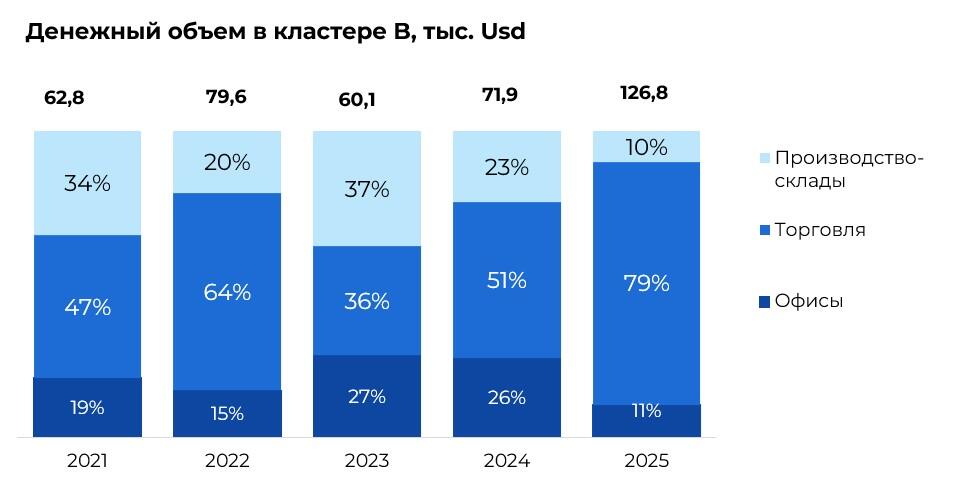 В регионах главный драйвер – торговая недвижимость. В областных центрах и городах-спутниках (кластер В) на нее пришлось почти 80% денежного объема.