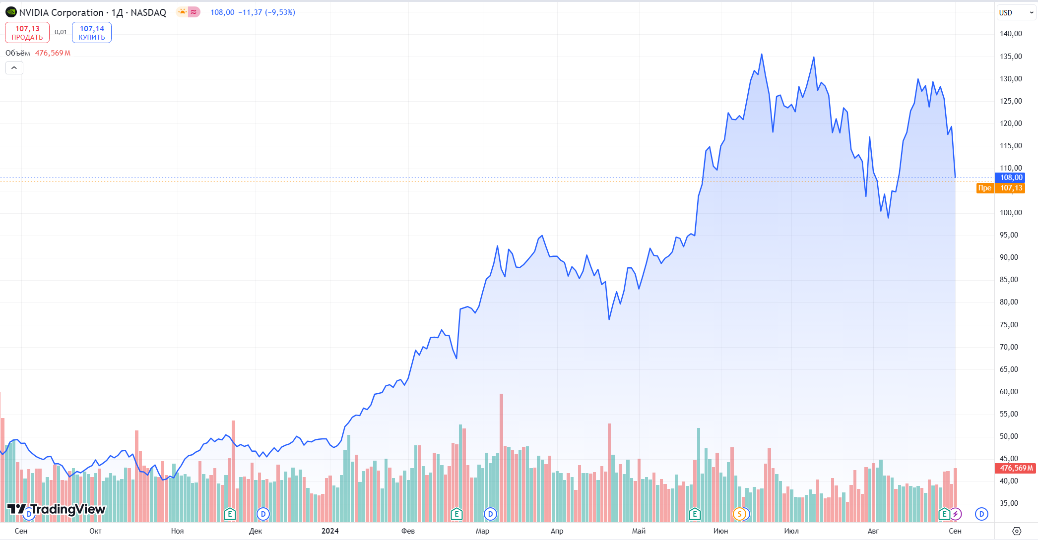 На открытии торгов 3 сентября 2024 года акции американского производителя чипов торговались на отметке $116 за штуку. На закрытии стоили $108, а уже на премаркете 4 сентября падали ниже $105.