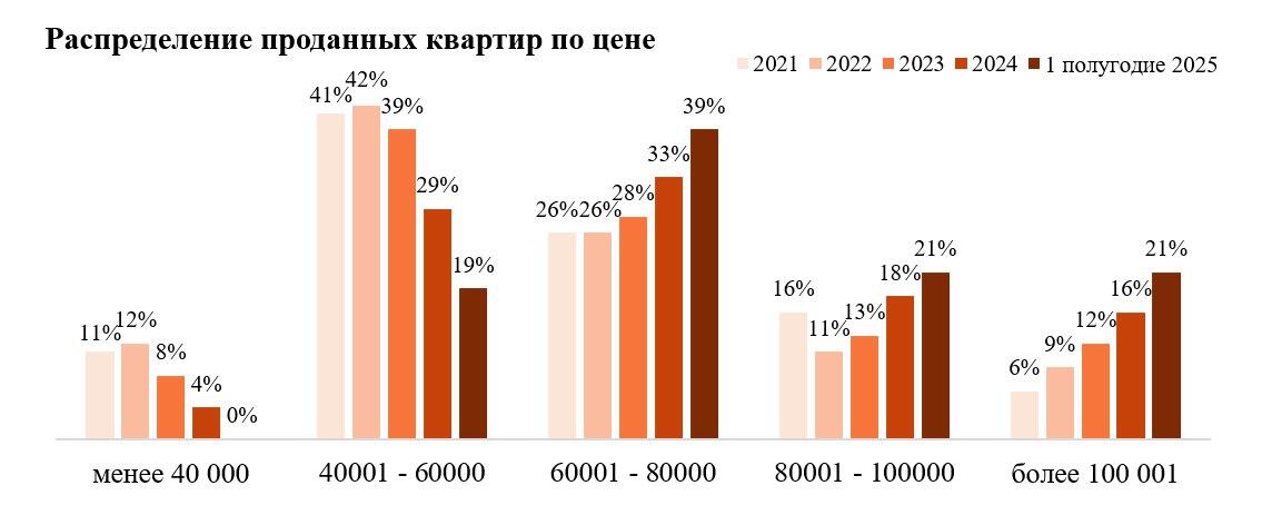 Ценовая динамика демонстрирует устойчивый рост. На фоне подорожания выросла доля квартир с ценой более $100 тыс., а в наиболее популярный диапазон от $60 до $80 тыс. попали 39% сделок (+6 процентных пунктов к показателям 2024 года). Около 20% всех сделок заключается по цене свыше $100 тыс. в эквиваленте.