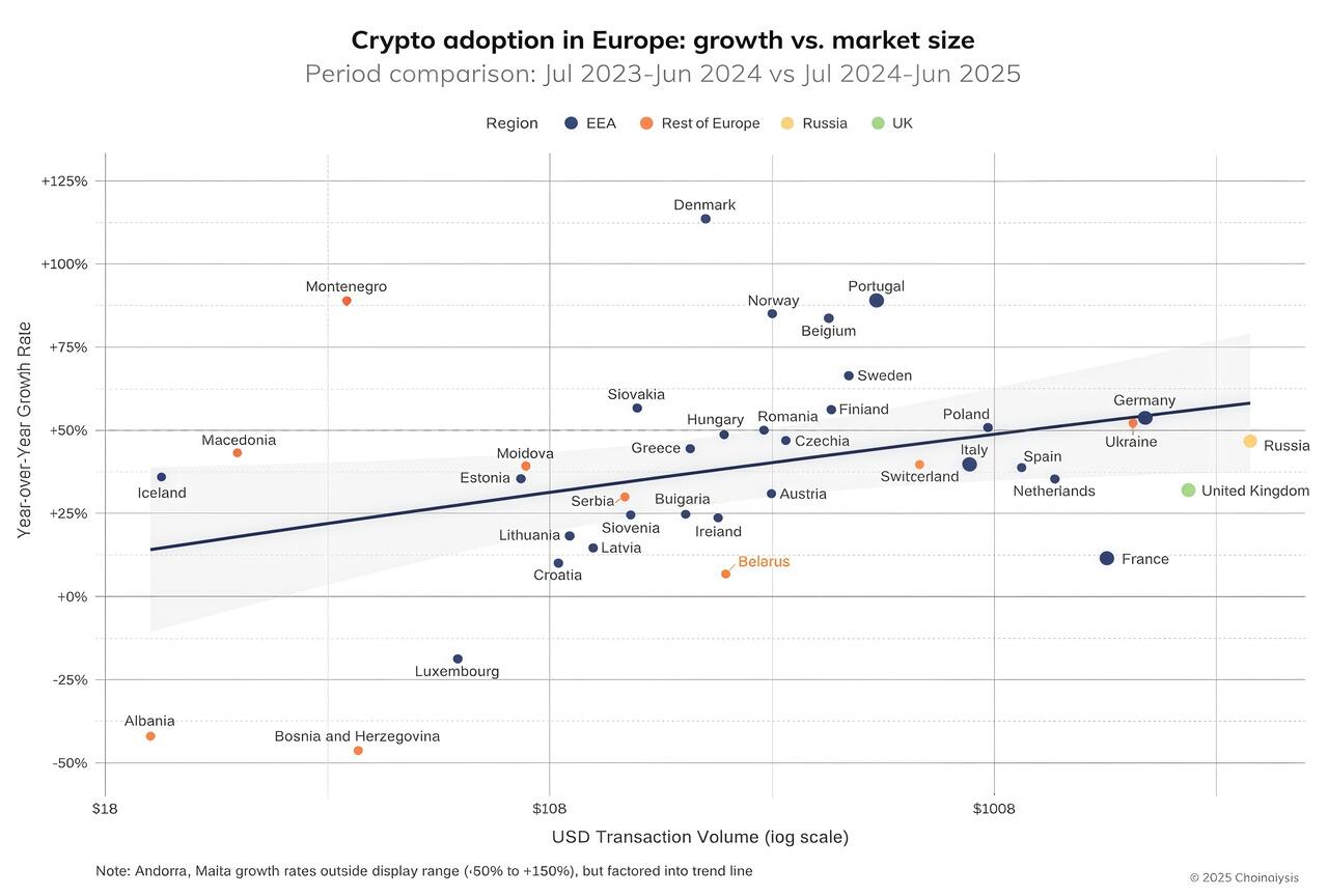 Эта тенденция соответствует классической динамике принятия криптовалют по S-образной кривой, где развитые рынки, такие как Германия и Россия, сохраняют высокую динамику, а не находятся на плато. Этот устойчивый рост на развитых рынках свидетельствует о том, что более крупные криптовалютные экосистемы выигрывают от повышения ликвидности, участия институциональных инвесторов и широкого признания. Данные свидетельствуют о том, что принятие криптовалют в Европе остается в фазе ускорения (на подъеме S-образной кривой), при этом сетевые эффекты способствуют дальнейшему росту даже на самых развитых рынках.