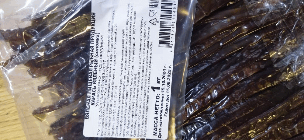 Речь идет о позиции «карась вяленый (соломка) весовой». В результате испытаний установлено, что массовая доля влаги вяленой пищевой рыбной продукции составила 23,2% при норме не менее 30%.