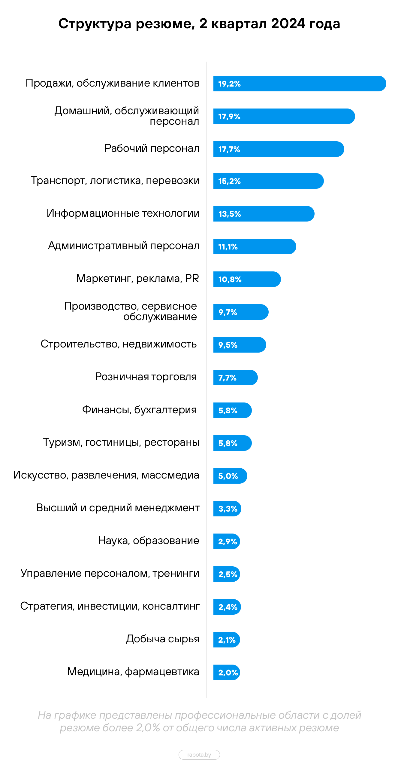 В структуре резюме на первой строке оказались соискатели в сфере продаж и обслуживания клиентов. В топ также попали соискатели из таких сфер, как «Домашний, обслуживающий персонал», «Рабочий персонал», «Транспорт, логистика, перевозки» и др.