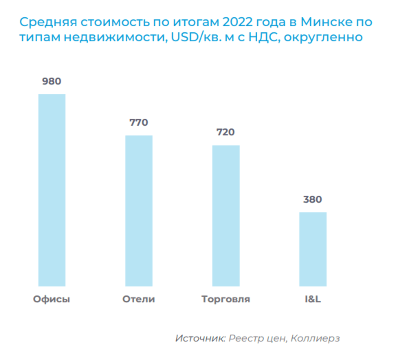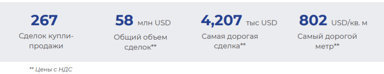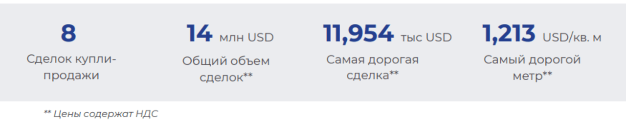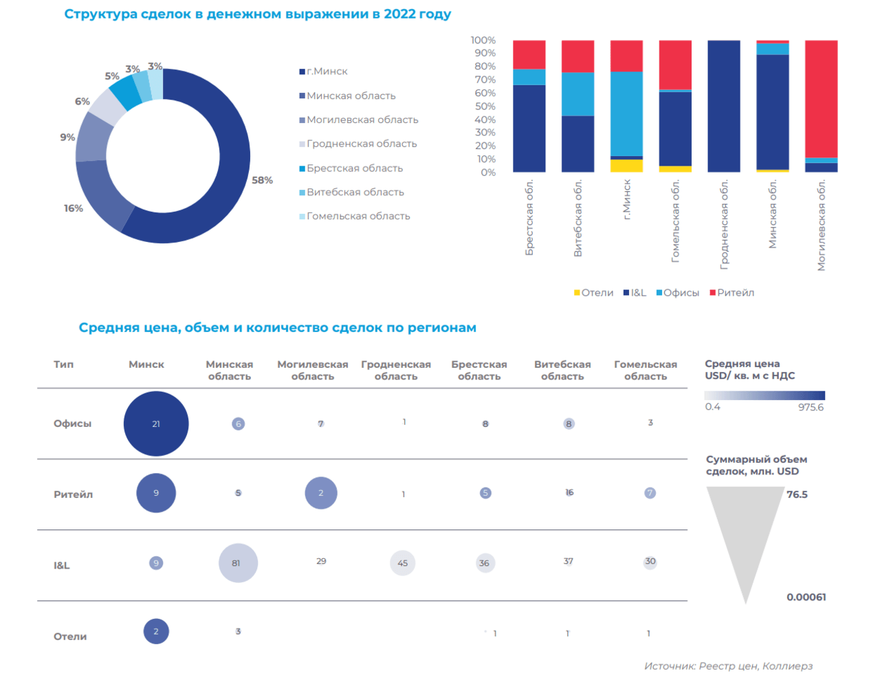В целом в 2022 заключено 374 сделки с объектами коммерческой недвижимости размером более 500 кв. м каждый на общую сумму более 207 млн USD. Средняя сумма сделки превышает 0,5 млн USD, а средняя цена за 1 кв. м составляет 173 USD (с учетом дешевых производственных объектов).