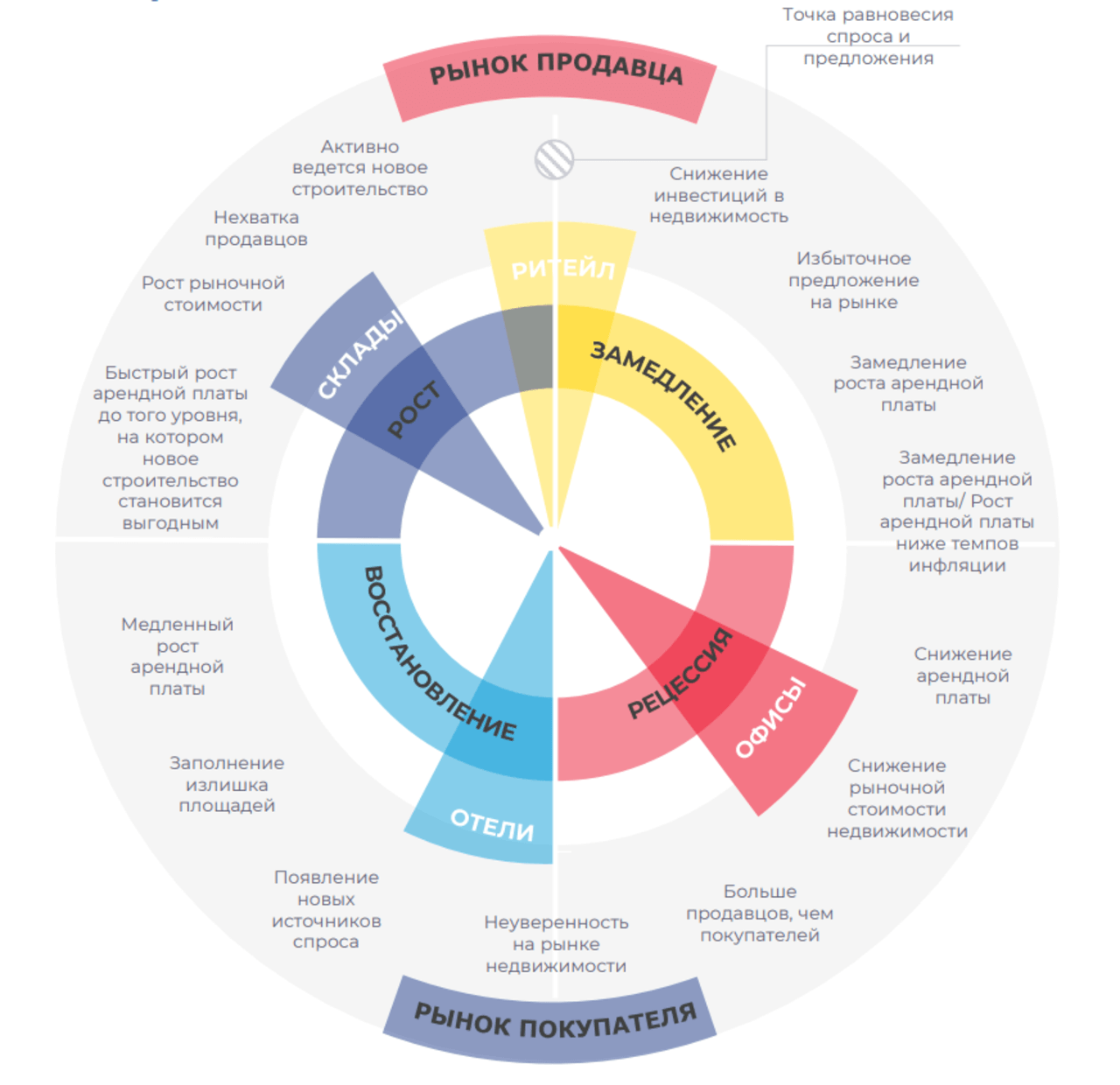 Зная фазу цикла, на которой находится рынок недвижимости в каждом сегменте, можно