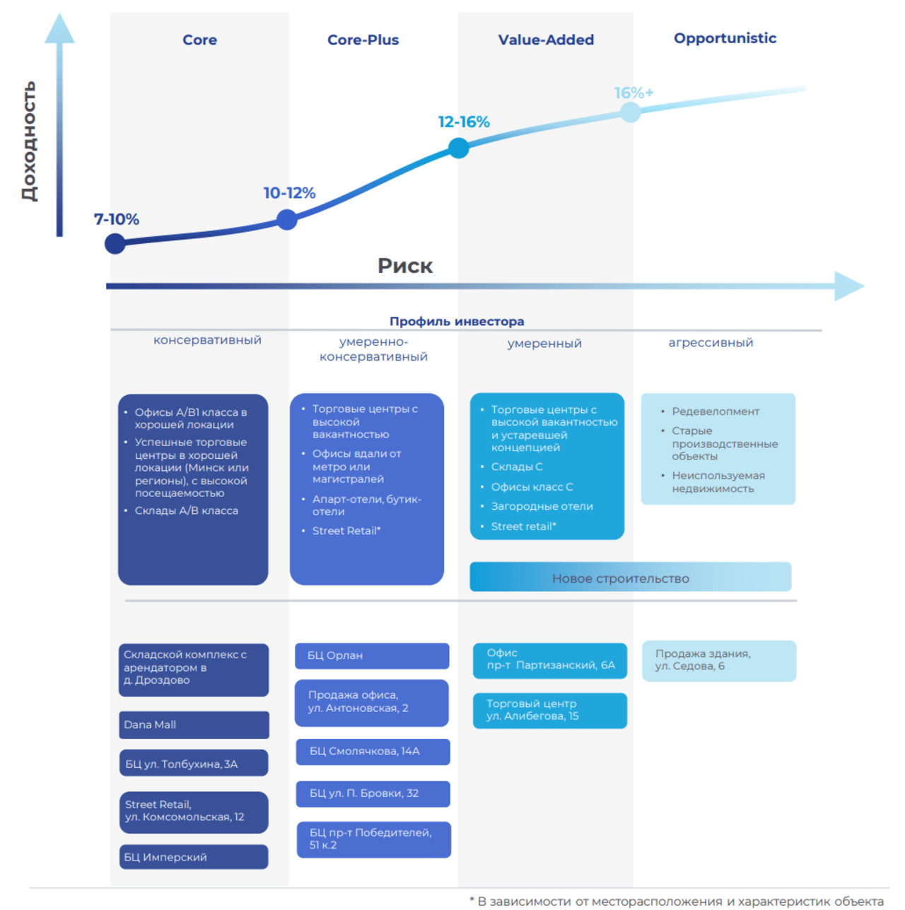 Оппортунистические (Opportunistic). Эта группа активов сопряжена с наиболее высокими рисками инвестирования ввиду наличия значительных сложностей либо на этапе реализации проекта, либо в процессе эксплуатации. Это может быть критичный уровень вакантных площадей, технические и конструктивные особенности, моральный или физический износы, финансовые обременения. К этой категории также относятся изъятые банками активы. Зачастую для управлением такого рода объектами требуются специальные знания и опыт, а также терпение, чтобы переждать спад на рынке и в дальнейшем реализовать объект по более высокой цене.